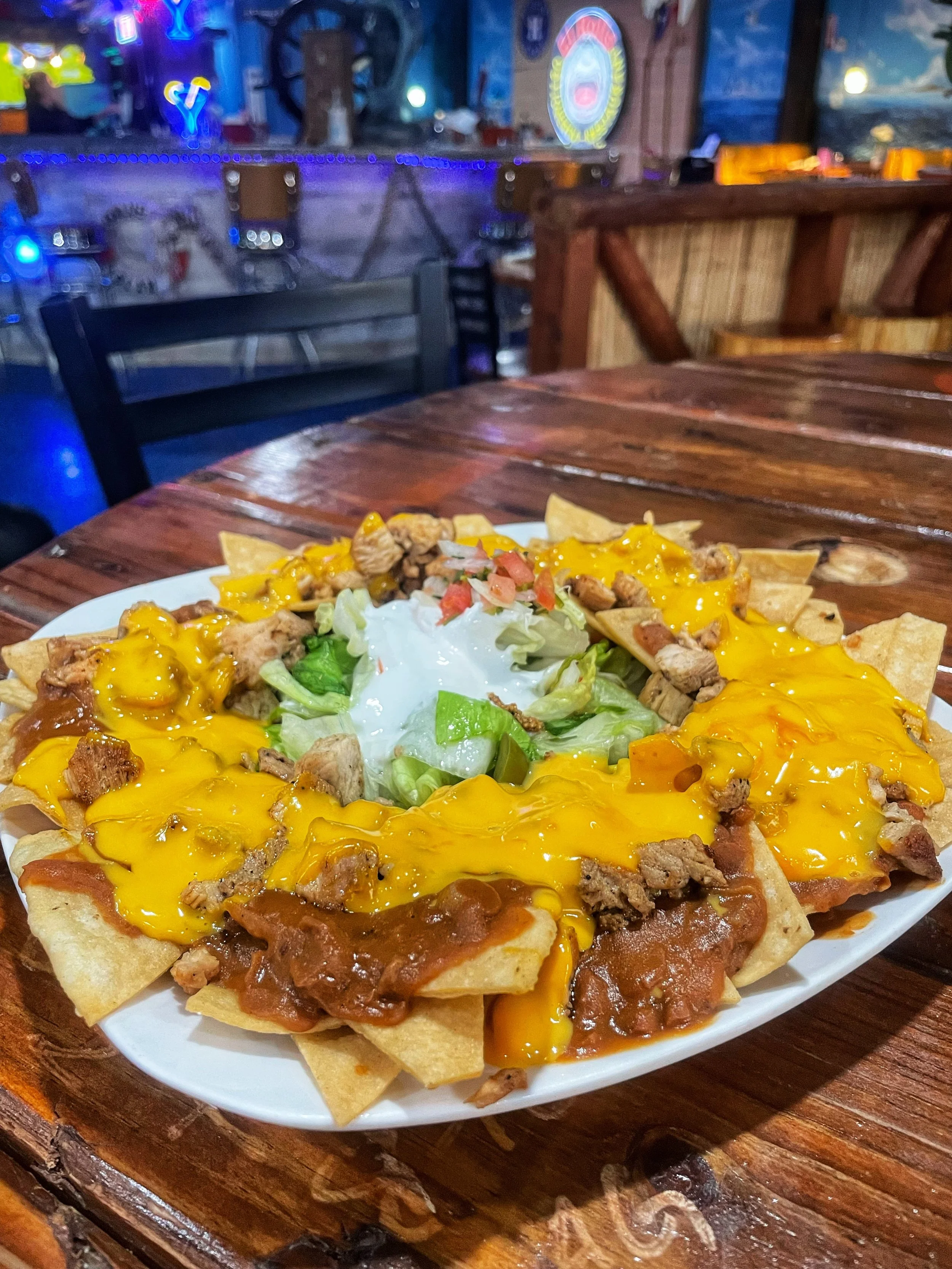 Nachos con queso derretido, jalapeños y crema agria.