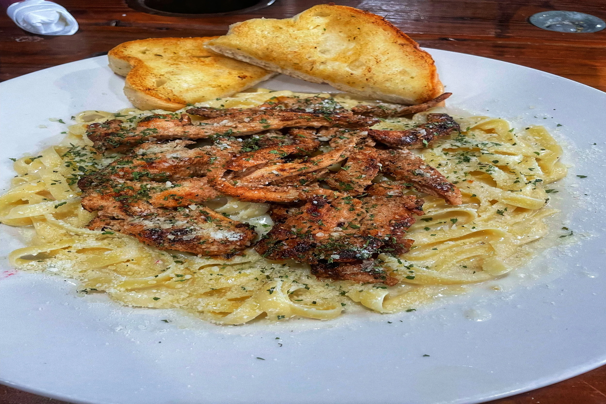 Pollo a la parrilla sobre pasta fettuccine con nuestra salsa Alfredo casera.