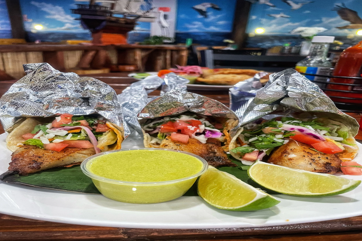 Tres deliciosos tacos de pescado o de Camaron en tortilla de maíz con lechuga, tomate y repollo, aderezados ligeramente con salsa chipotle.